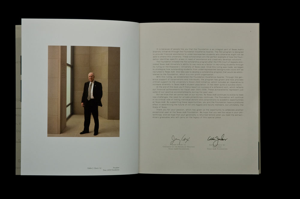 Annual Reports Title: Texas A&M Foundation 2006 Annual Report Client: Texas A&M Foundation Art Director: Mark Geer Copywriter: Dorian Martin, Kara Socol Photographer: Robb Kendrick Printer/Production: Grover Printing
