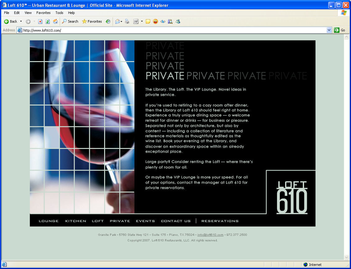 Entertainment/Retail Web Sites Title: Loft 610 Web Site Client: Loft 610 Creative Director: Bret Sano Copywriter: Wayne Geyer Designer: Michael Beukema Programmer: John Richardson, Brian Small